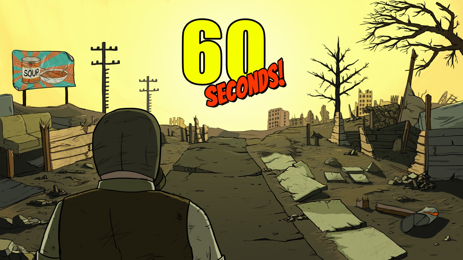 60 giây! là một cuộc phiêu lưu nguyên tử hài hước đen tối về nhặt rác và sinh tồn. Thu thập nguồn cung cấp và giải cứu gia đình bạn trước khi vụ nổ hạt nhân xảy ra. Sống sót trong nơi trú ẩn bụi phóng xạ của bạn. Đưa ra những quyết định khó khăn, chia khẩu phần ăn và săn những con gián đột biến. Và có thể sống sót. Hoặc không.